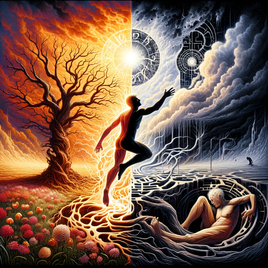 Além das nossas tentativas conscientes de sobreviver e prosperar, existe uma propensão subjacente para regressar a um estado inorgânico? Agora, vamos dar uma olhada mais de perto na teoria de Freud. Todos nós já testemunhamos isso em outras pessoas ou, talvez, até mesmo experimentamos pessoalmente um curioso interesse pela autodestruição. Pode ser o desejo de ingerir grandes quantidades de intoxicantes como forma de se desligar, acompanhando o risco de envenenamento e outras consequências para a saúde potencialmente a longo prazo. Ou que tal o desejo inexplicável de automutilação, como cutucar uma ferida ou envolver-se em comportamentos mais violentos e autodestrutivos que causam danos físicos? Qual é o fascínio dessas formas de autodestruição? Poderiam surgir de um anseio interior misterioso e indescritível pela morte?
